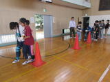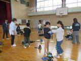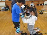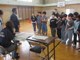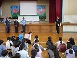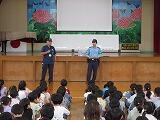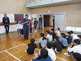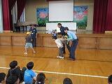 後半は、体育館で身を守る行動について、スクールサポーターの横田さん、交番所長の伊藤さんに講話をいただきました。ランドセルをつかまれたときの対応など、実践を交えて学ぶことができました。