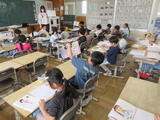 2年生は1組が図工の授業で、「みんななかよし」というテーマで絵をかいていました。2組は算数の授業で、AIドリルの活用法の話を聞いていました。