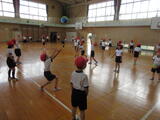 3年生は体育館で体育の授業でした。2人組でいろいろな距離でボールを投げる活動習をしていました。