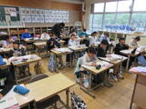 本日は6年生が1・2時間目に全国学力学習状況調査で、5年生が1~3時間目にCBTとちまるチェックがありました。写真はテスト間の様子です。次のテストが始まるまで静かに待っていました。