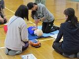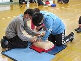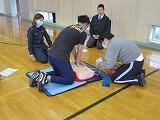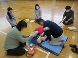 胸骨圧迫、AEDの使い方等をグループに分かれ、大人用と子ども用のミニアンも用意していただき実習を行いました。子どもたちの命を守るため、教職員もこうした研修を毎年行っています。