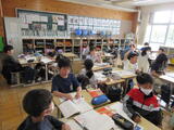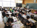4年生は国語の授業でした。1組は漢字辞典の使い方を勉強していました。2組は「日記にしたい春の行事」について調べていました。