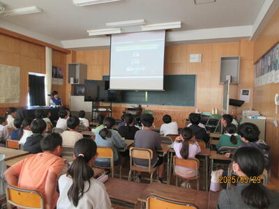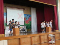 校内の「歯と口の健康週間」の一環で、保健委員会がお昼の放送で歯磨きを呼び掛けたり、標語や作文を紹介したりしました。集会では、なかよし班で協力してクイズの答えを考え、歯について楽しく学ぶことができました。