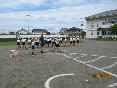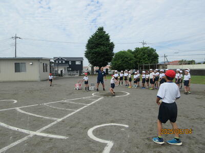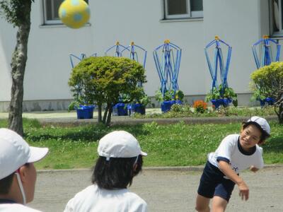 ソフトボール投げや立ち幅跳びにつながるような運動を行いました。楽しみながら運動に取り組んでいました。