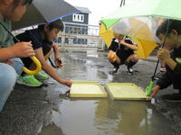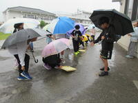 今日の天気は雨ということで、校庭には水たまりや、小さな川のように水が流れているところもありました。パットの上にビー玉を乗せて、地面の傾きと水の流れを観察することができました。