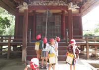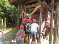神社の龍や獅子などの彫刻を見て、「木でできている」「迫力があってすごい」と感心していました。
