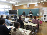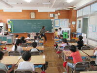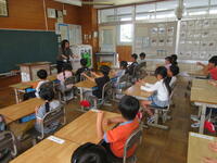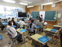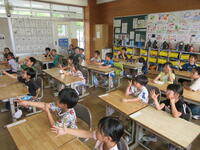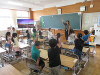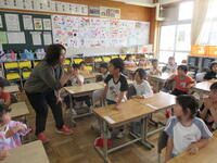 1年生は、ALTのマイリン先生と初めての英語活動がありました。授業の始まりのあいさつでは「Stand up!」の号令で、右手を挙げて「Yearh」と元気に立ち上がります。あいさつの後「Hello song」を歌詞に合わせて身体表現をしながら歌いました。