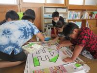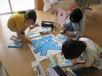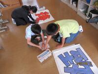 代表委員会で話し合ってスローガンが決まり、6年生の係の子とボランティアの子が協力して、スローガンパネルの作成をしました。