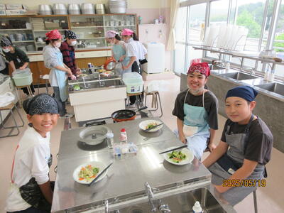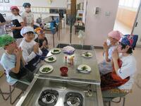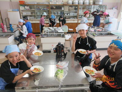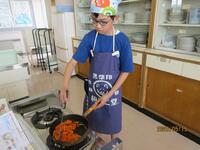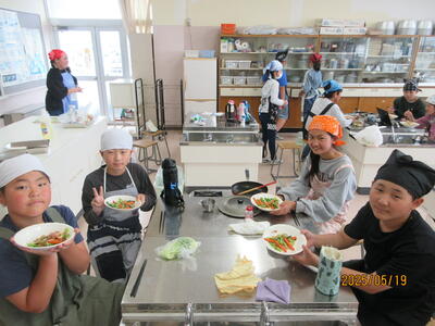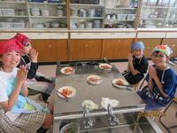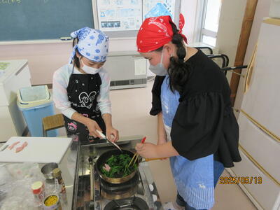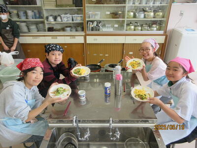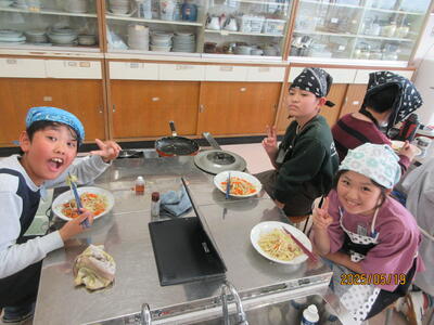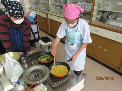 今回はのテーマは「炒め物」でした。それぞれの班が野菜炒めに挑戦しました。給食の後の5・6校時でしたが、自分たちで作った野菜炒めをみんな嬉しそうに食べていました。