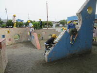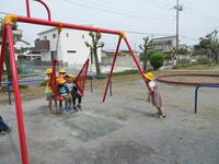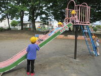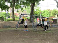 公園では、学校とはまた違った様々な遊具に、皆夢中で遊んでいました。途中で踏切が鳴り、電車が通ると手を振ったり、順番を守って交代で仲よく遊んだり、木の実を拾ったりと、思い思いの遊びができました。