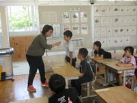 今日は、名前を聞かれて「My name is ○○○○.」と答える練習をしました。英語のじゃんけんの言い方も教わり、ペアで英語じゃんけんをして名前を言い合ったり、マイリン先生のインタビューに一人一人答えたり、先生とじゃんけんをして勝った人から名前を言ったりと、何回も練習するうちに、自信を持って大きな声で皆言えるようになり、ご褒美シールをいただきました。次回の6月も楽しみですね。