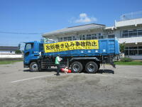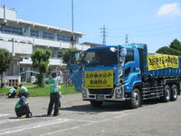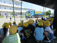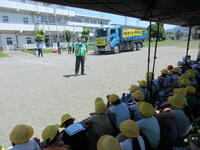 栃木県トラック協会の皆様から、トラックの内輪差、運転手さんから見えない死角、飛び出しの怖さなどを実験を通して学びました。人形が後輪に巻き込まれたり、飛び出した子どもの代わりのボールが車に衝突して跳ね飛ばされたりする様子を見て、日頃の歩き方を振り返り、交差点での待ち方や横断の仕方を考えることができました。