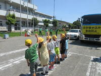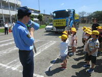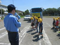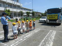 そして、佐野警察署のおまわりさんから、横断歩道の歩き方について実際に一人一人体験しながら学びました。手前のトラックが止まってくれても、その奥から車が出てくるかも知れない。友達につられないで、自分の目で運転手さんとアイコンタクトをとることの大切さを確認しました。