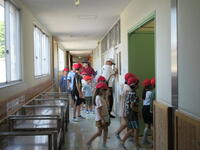 廊下や階段では速やかに避難できるように譲り合いながら、おかしもちを守り、避難することができました。