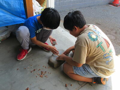 また、どんぐりをすりつぶしたり、火をおこしたりする体験もしました。